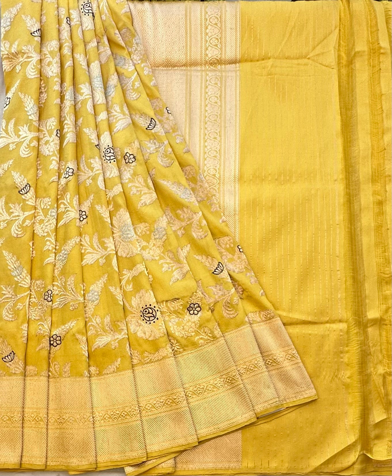 YELLOW FLORAL DESIGNER PURE RAW SILK SAREE