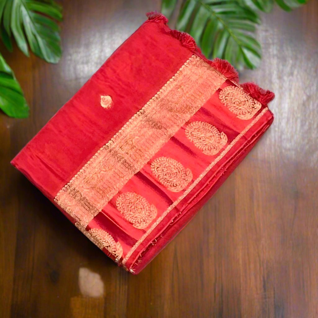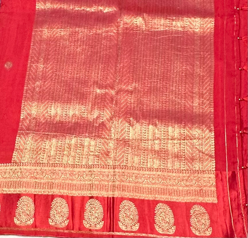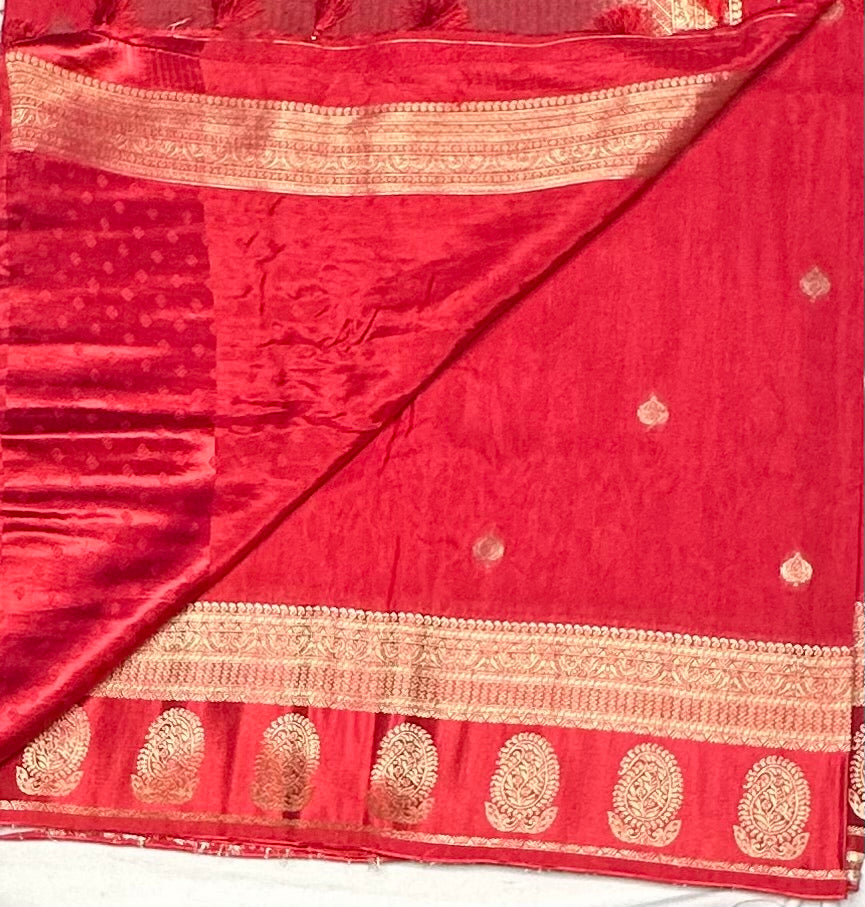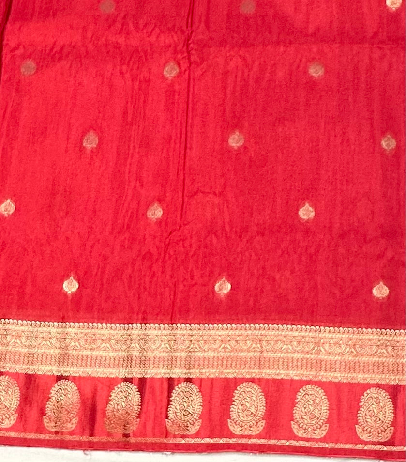 This elegant Banaras crape party saree features a stunning red color with intricate gold Jari border, perfect for any special occasion. NOTE; colour may slightly change due to camera nd lighting effect