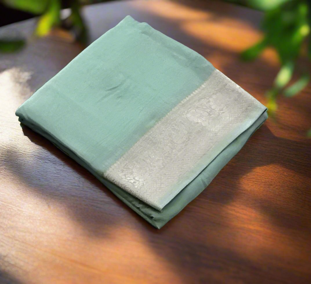This pastel green banarasi crape saree offers a unique and elegant addition to any occcasion. it provides comfort and style, this saree is sure to make a statement. NOTE; colour may slightly change due to camera nd lighting effect