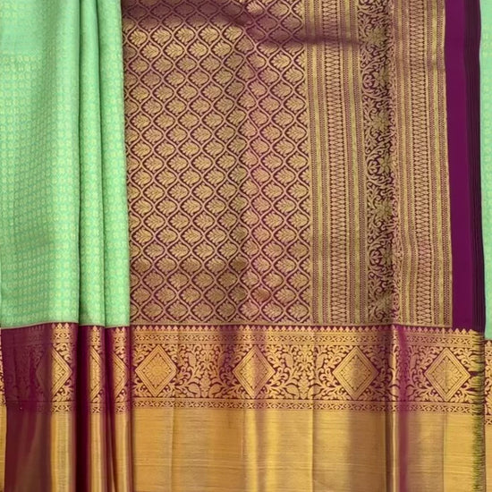 light green pure kanjivaram saree with maroon border with small design all over body suitable for wedding nd special occasions. Note; slight colour change may be seen due to camera nd lighting effect. Length; 6.3 mts including blouse. Care tip; Dry wash only.